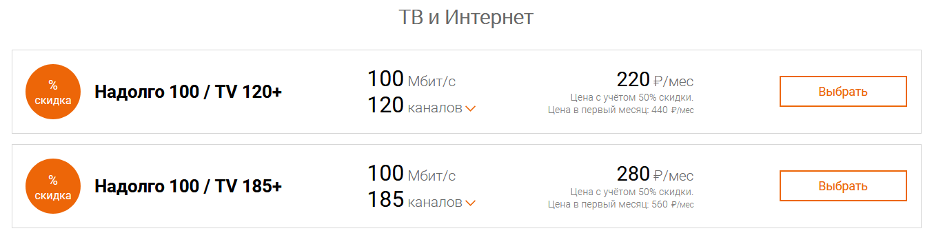 - «Надолго 100 ТВ 120+» — скорость 100 Мбит/с и 120 каналов за 220 рублей;
