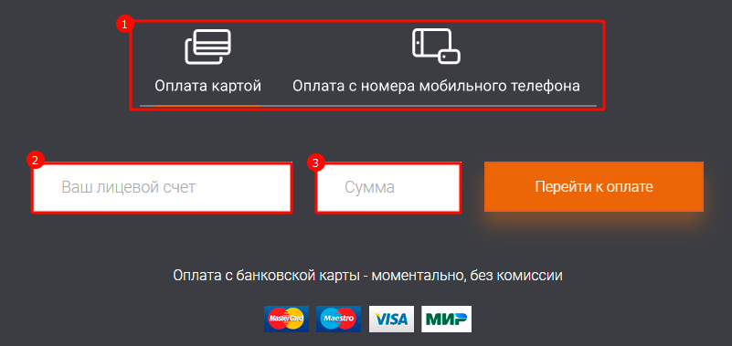 На открывшейся странице выберите вариант оплаты: картой или со счёта мобильного телефона. Затем введите свой абонентский номер и сумму к переводу.